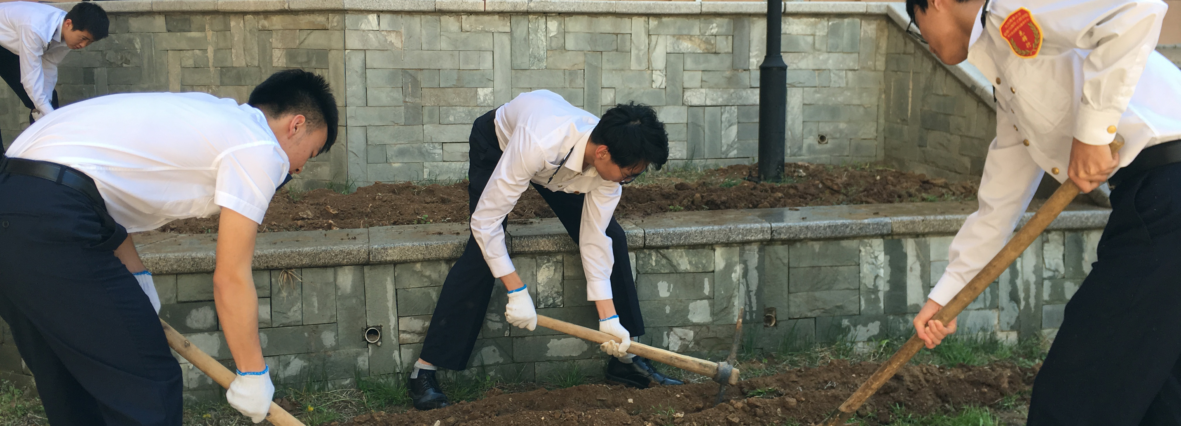 6日中午12点整,暖风习习,整个海大笼罩在午间轻松愉悦的氛围中,中心全体成员已经备好手套、铁锹等工具,按部门列队、分组分工,投入到紧张有序的劳动中。从清理荒地碎石砖块、拔除杂草,到测距定点、划线挖沟,不知不觉一个小时已经过去,荒废已久的空地已经焕然一新。次日正午,中心成员们将提前用生根粉浸泡过的月季花株搬运至栽种地点,沿着之前挖好的花沟一人栽花浇水、一人填土推平,配合默契。中心成员的行动引得不少经过的行人驻足,大���在了解成员们的行动后纷纷表示:一定会好好保护这片意义非凡的花木,用花香祝福海大生日快乐。