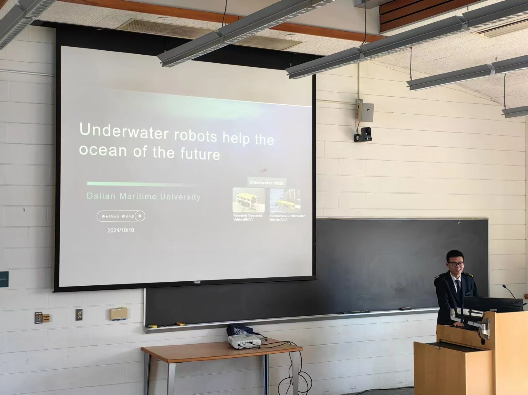王伟浩作为中国表在学生论坛环节发表了题�Underwater Robots Help the Ocean of the Future的演�。他主要介绍了水下机器人技术如何在保护海洋生态、提高水下作业效率以及应对海洋环境变化等方面发挥重要作用,王伟浩的发言赢得了与�代表的热烈掌声,充分展现了我院学生过硬的专业素养与良好的精神风貌�