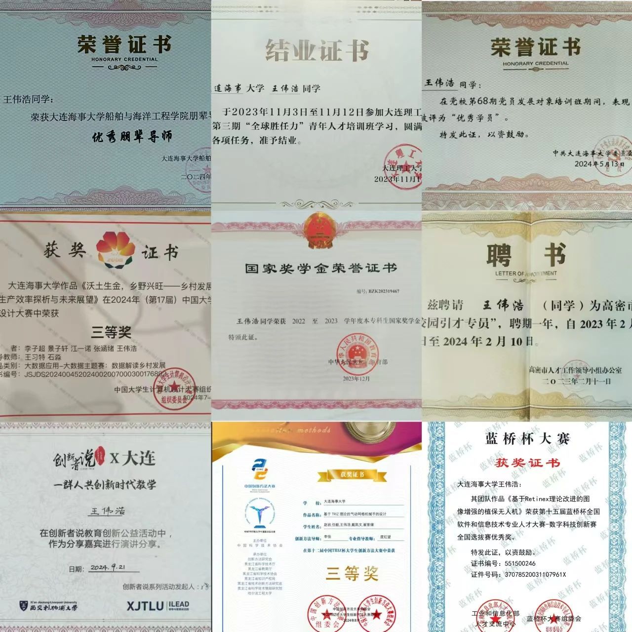 长期以来,王伟浩同学始终铭记“学汇百川,德济四海”的校训,自入学以来便立志追求卓越,努力学好专业知识,单学期绩点最高达4.47,目前为�30门专业课程成绩超�90分;同时,他还积极参加各类科研竞赛等,先后获得国家级A类竞赛、省级、校级奖�10余项,跟随专业教师参与水下机器人研究发表论文两篇,作为第一发明人成功申请外观专利一项。除此之外,王伟浩同还积极投身社会实践,志愿服务、学生工作中,用实际行动诠释了一位敢于有梦、勇于追梦、勤于圆梦的海大学子�