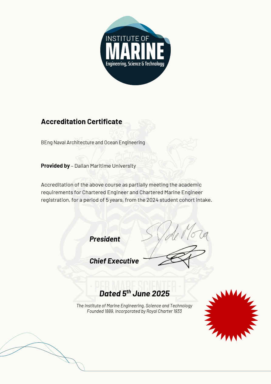船舶与海洋工程专业正式获得英国海事工程与科学技术学会(Institute of Marine Engineering, Science & Technology, IMarEST)颁发的工程教育认证证书,认证有效期5年,标志着九游