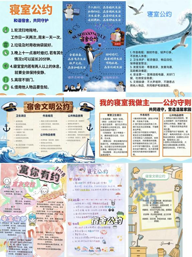 同步发起“寝室文化公约制定”主题活动,倡议各寝室量身定制个性化公约。活动发起后,各寝室在寝室长组织下,围绕作息制度、内务标准、学习氛围、公共责任等核心议题展开民主讨论,共同拟定并签署属于本寝室的“特色章程”。同学们还充分发挥创意,将公约内容设计成形式多样、意蕴丰富的文化海报,张贴于寝室墙面,实现了“公约上墙、共识入心”,展现出船海学子共建共享、向上向善的寝室文化风貌。