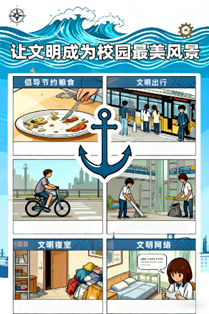 依照“寝室文明、交通文明、食堂文明、教室文�、场馆文明、网络文明”六项主题,我院以创意设计、打卡实践、主题征文等形式展开各类活动,引导学生用镜头记录文明瞬间、用画笔传递文明理念、用行动践行节约美德、用竞赛深化文明认知、用公约凝聚寝室共识、用文字传播网络文明��